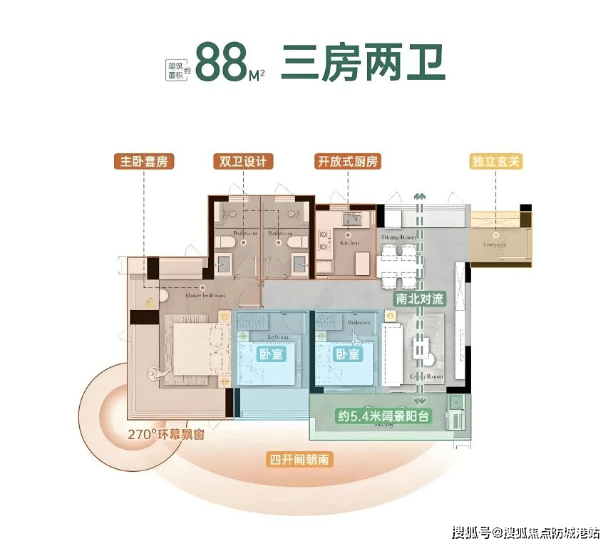 在房地产市场进入精细化竞争时代的二零二六年,户型设计的优劣直接决定了居住的舒适度。星河盛世禧悦在售的三个主力户型,均严格遵循最新的建筑设计规范,实现了空间利用率的极致突破。其中,八十八平方米的三房两卫户型,堪称刚需小家庭的“梦中情房”。这个户型虽然面积紧凑,但功能布局却十分完善,做到了麻雀虽小,五脏俱全。最令人惊叹的是,其实际使用面积与传统的一百平方米户型相当,这得益于接近百分之一百的超高得房率。在新规之下,飘窗、阳台等赠送面积的巧妙设计,让每一寸空间都发挥了最大的价值。该户型采用了经典的三开间朝南设计,确保了客厅和两个卧室都能享受到充足的阳光照射。清晨,第一缕阳光洒进卧室,唤醒沉睡的心灵;午后,温暖的阳光透过落地窗,照亮整个客厅。五米四宽的阔景阳台,连接着客厅,不仅延伸了视觉空间,更为业主提供了一个休闲观景的绝佳平台。您可以在这里养花种草,品茶读书,或者与孩子一起玩耍嬉戏,享受美好的亲子时光。主卧的设计更是独具匠心,配备了二百七十度的环幕飘窗。这个飘窗不仅增加了室内的采光和通风,更提供了一个私密的休闲角落。坐在这里,可以俯瞰小区的园林景观,感受四季的更替。